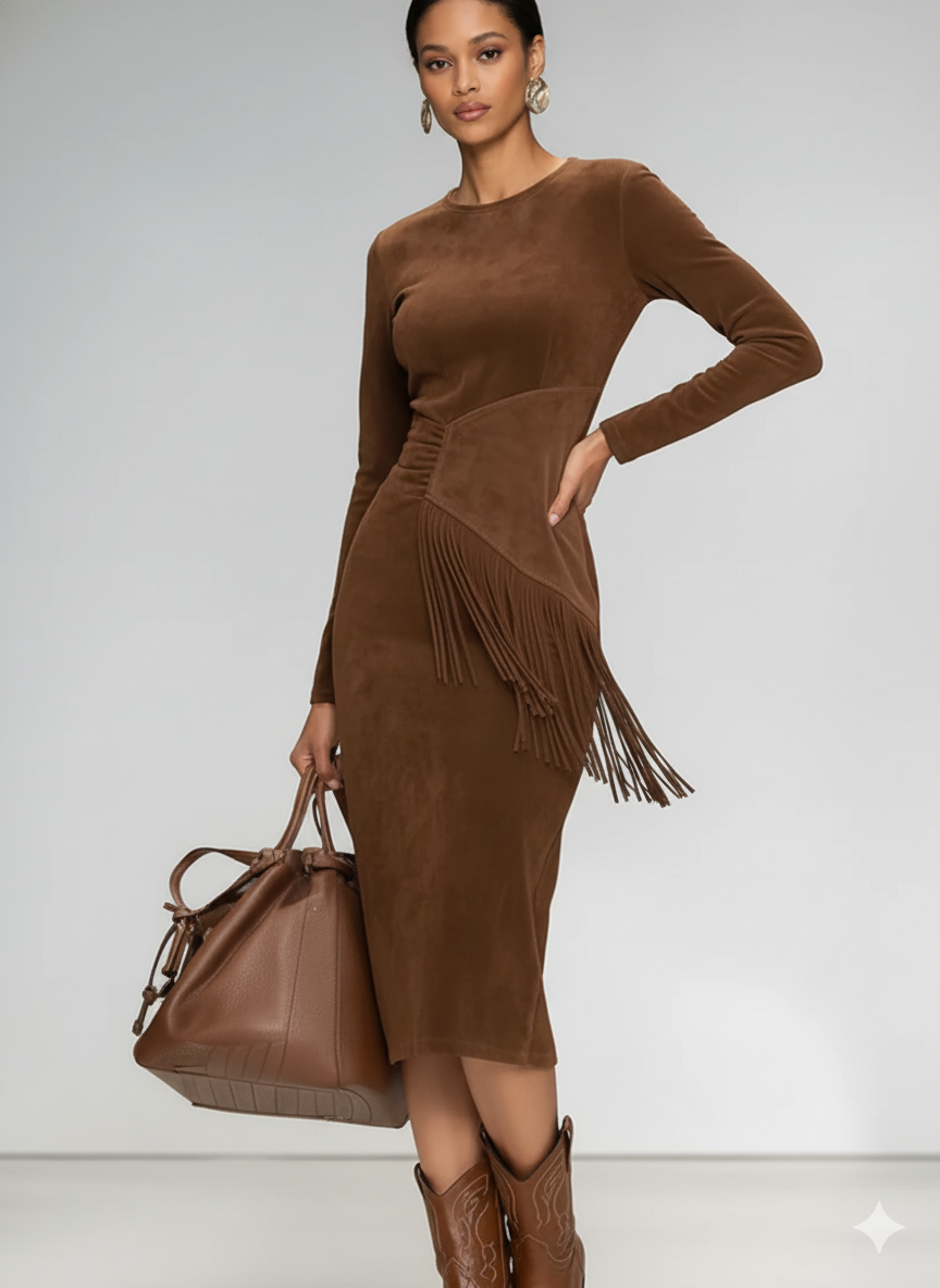 Cette robe, à la fois rétro et moderne, est idéale pour faire une déclaration subtile. Les détails en franges insufflent une dose de fantaisie, tandis que le col rond et les manches longues assurent une élégance discrète. Associez-la à des bottines en cuir ou en suède pour un look bohème, ou optez pour des escarpins classiques pour une allure raffinée. Avec la robe Saint-Texane, chaque occasion devient une opportunité de briller.