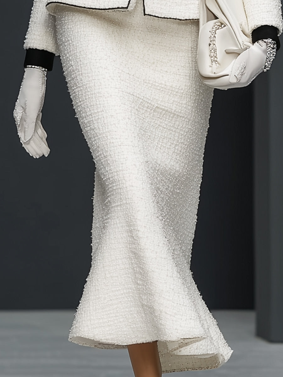Découvrez l'élégance intemporelle de notre ensemble Veste en Tweed Blanc Patchwork avec Ruban Noir et Jupe Queue de Poisson.