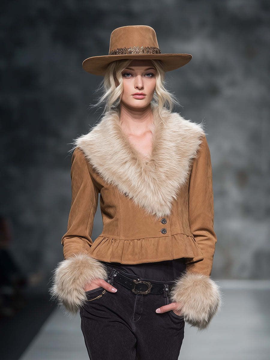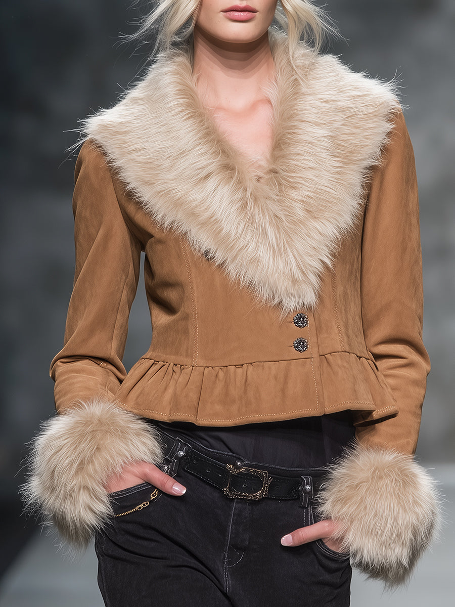 Le col en fourrure luxueux apporte une touche d'élégance, assurant chaleur et raffinement, tandis que l'ourlet volant ajoute une note ludique et féminine. Sa coupe confortable s'adapte à tous les types de corps, faisant de cette veste un choix incontournable pour les fashionistas modernes.