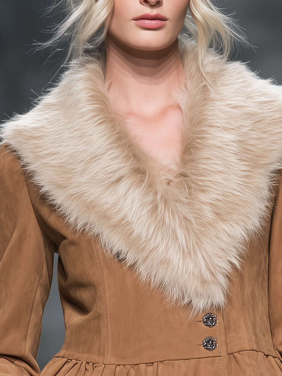 Veste Kaki en Suédine avec Col en Fourrure Rétro et Ourlet Flottant