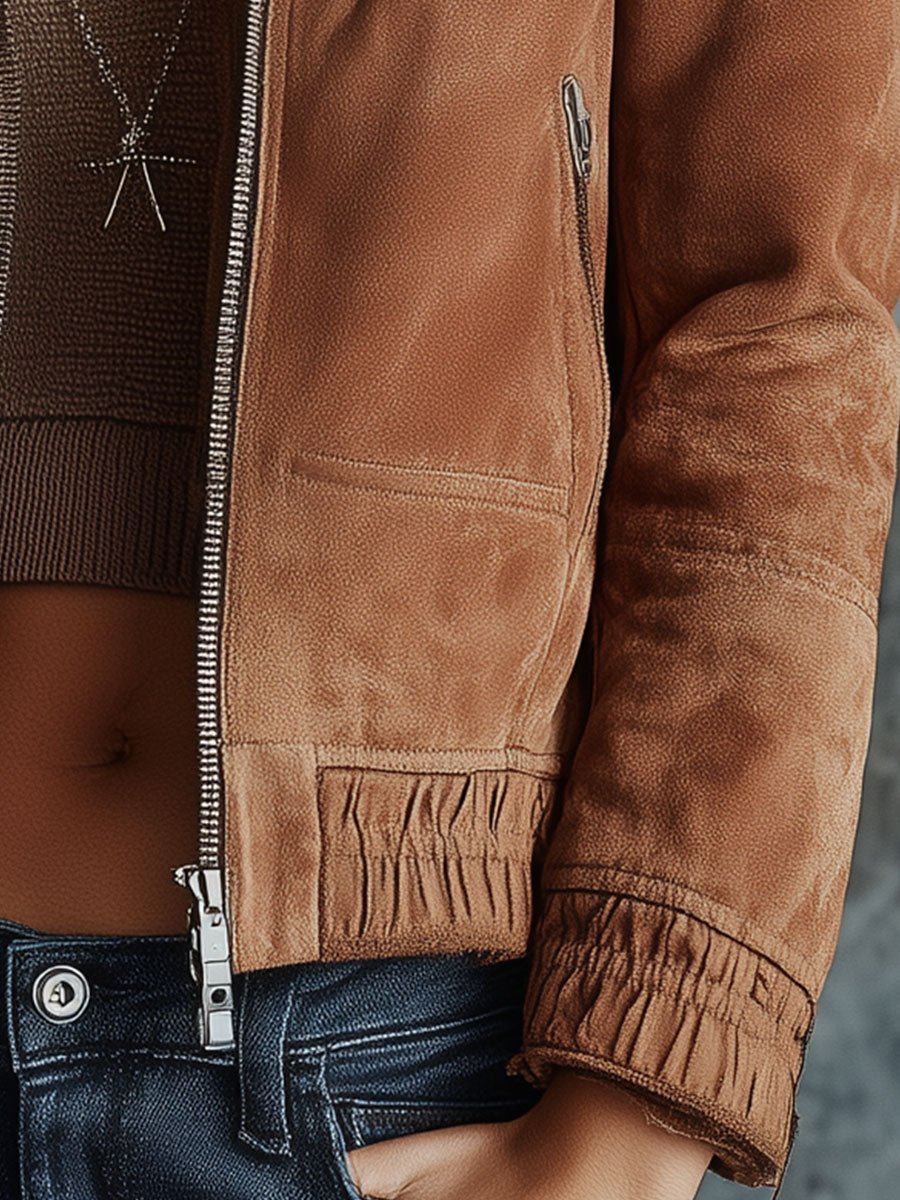Veste Zippée en Suédine Marron avec Douce Finition en Peluche Vintage